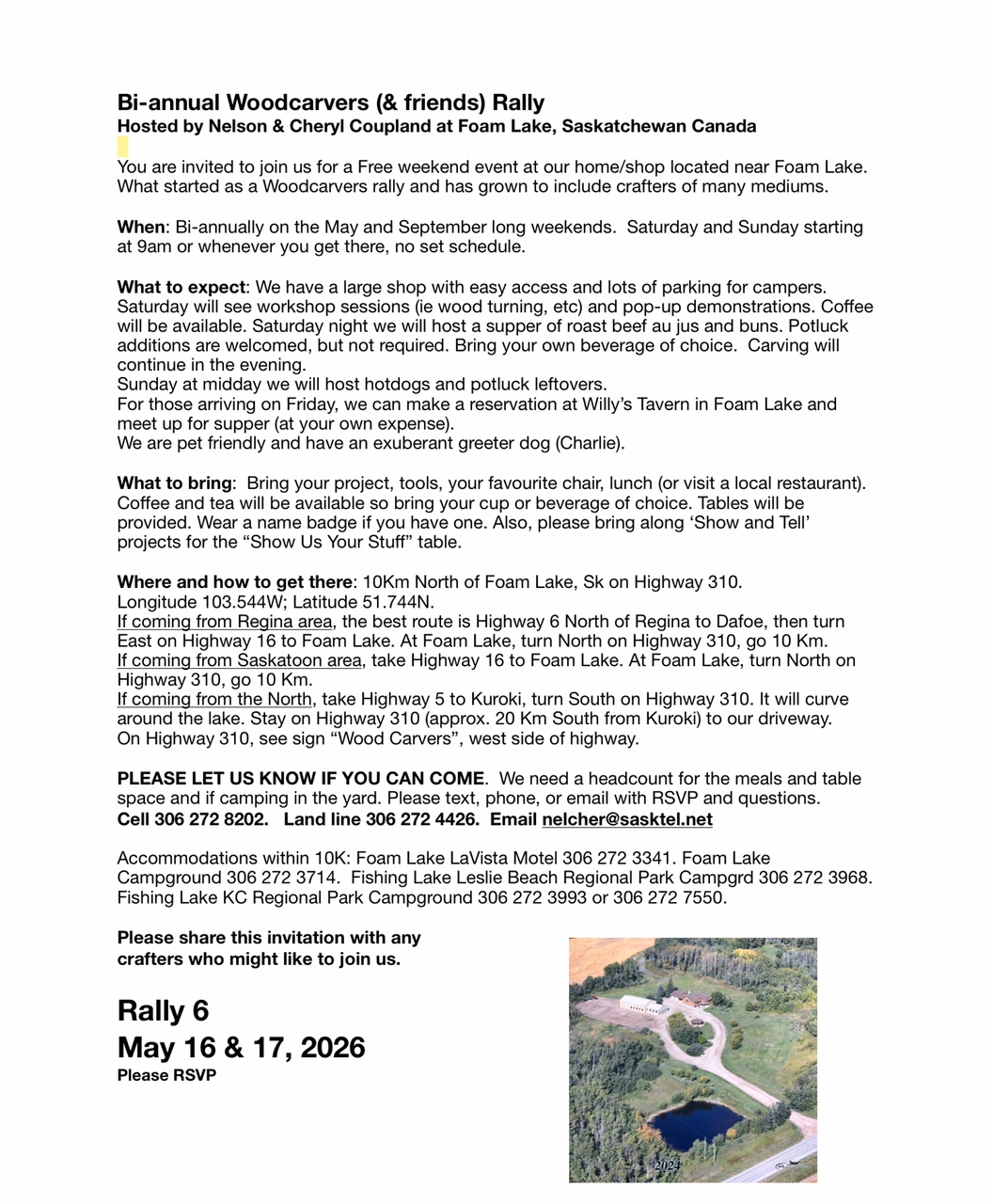 Attached is information on Woodcarvers Rally 6, May 16 & 17, 2026, at Foam Lake. This year we will have two wood turning workshop leaders, namely Al Jardine and Trent Watts. They will do demos and/or teaching, based on interests. Other pop-up demos will be added. I will keep you posted as new plans unfold.